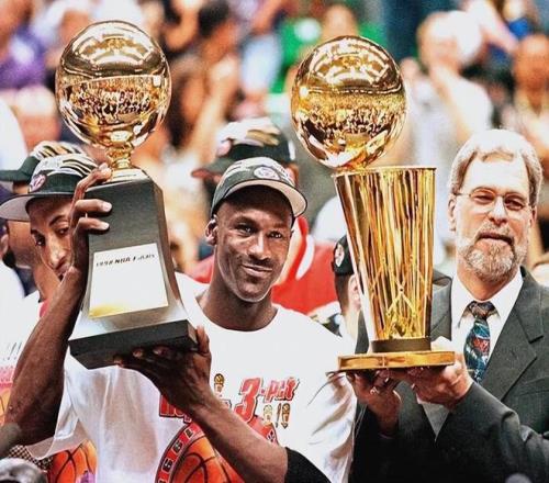 更为恐怖的是,他们在季后赛中经历了一番激战,在总决赛成功击败了爵士队,乔丹上演了载入史册的“世纪一投”,完成了个人的六冠王朝,统治了整个九十年代,同时也拿到了个人生涯的第6座总决赛MVP,自此也是完成了第二次的单赛季MVP大满贯。